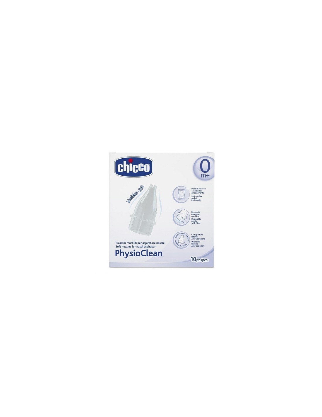 - 3 beccucci anatomici monouso morbidi, adatti alla narice sensibile e delicata delneonato, con aperture laterali ANTI OCCLUSIONE (sistema brevettato), che permettonosempre una completa aspirazione delle secrezioni. Ogni ricambio è sigillatosingolarmente per garantire la massima igiene.