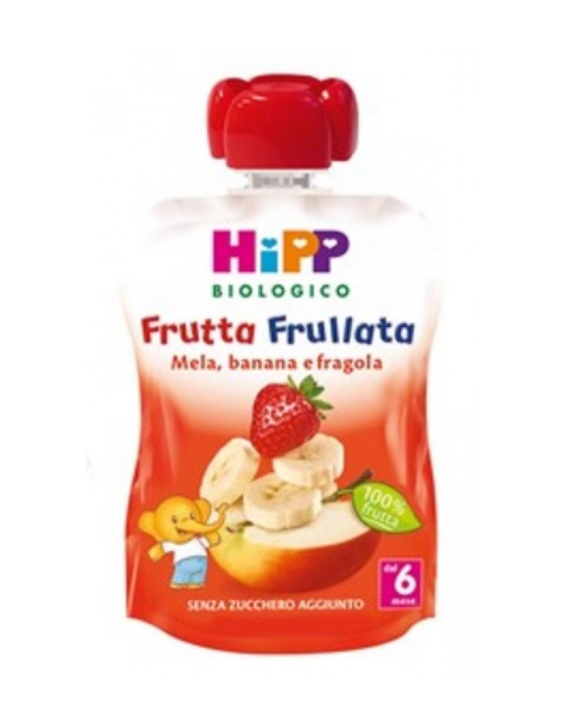 100% frutta (mela% 60%, purea di banana% 20%, fragole% 20%), antiossidante: acidoascorbico.