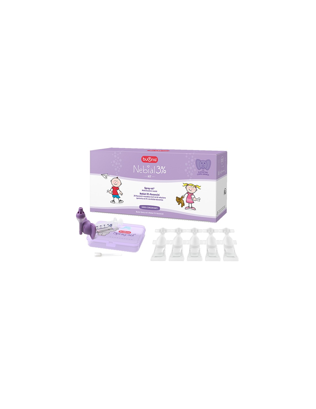 Nebial 3% KIT permette la nebulizzazione della soluzione ipertonica di Nebial 3%flaconcini, mediante il dispositivo medico spray-sol (brevetto in licenza esclusiva SteveJones srl).