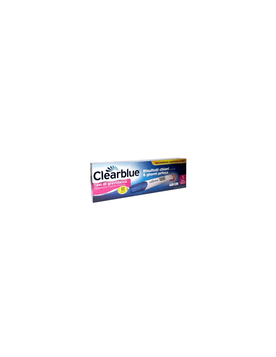 DescrizioneTest di gravidanza digitale che rileva l'ormonedella gravidanza hCG con una sensibilità pari a 10 mIU/ml. Ha un'accuratezzasuperiore al 99% nei test di laboratorio a partire dal giorno di inizio ciclo previsto.